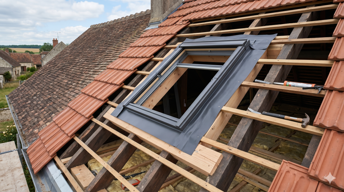 Installation d’une fenêtre de toit à Germigny-l’Évêque : création d’un chevêtre de charpente sur mesure, mise en place d’une collerette BFX et isolation renforcée pour garantir l’étanchéité et éviter toute infiltration.