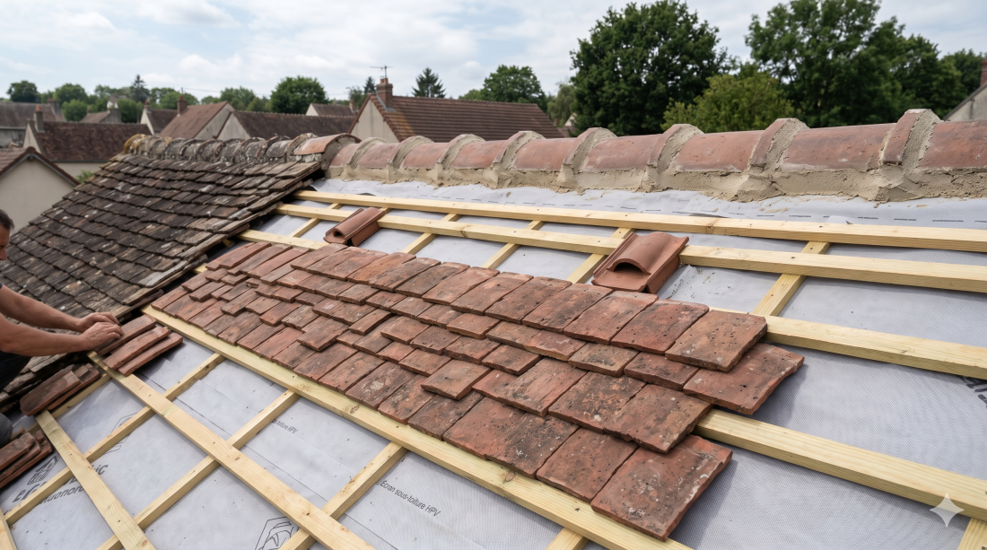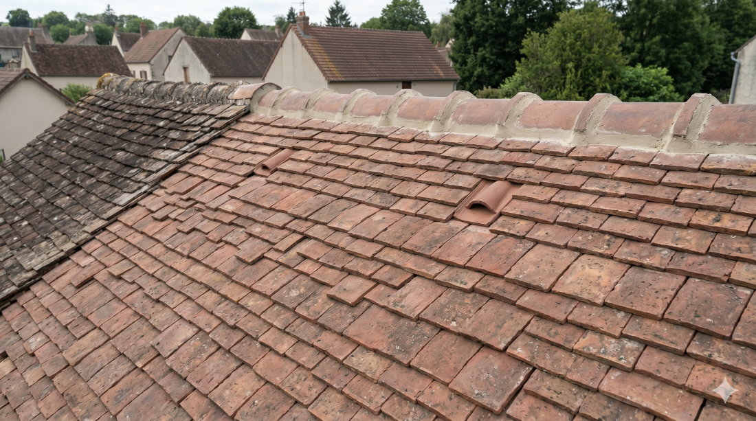 Rénovation à Trilport : pose de tuiles plates de pays à pureau brouillé, liteaux en sapin traité, écran HPV, faîtages refaits au mortier de chaux et chatières de ventilation. Prévention de l’humidité et protection de la charpente.