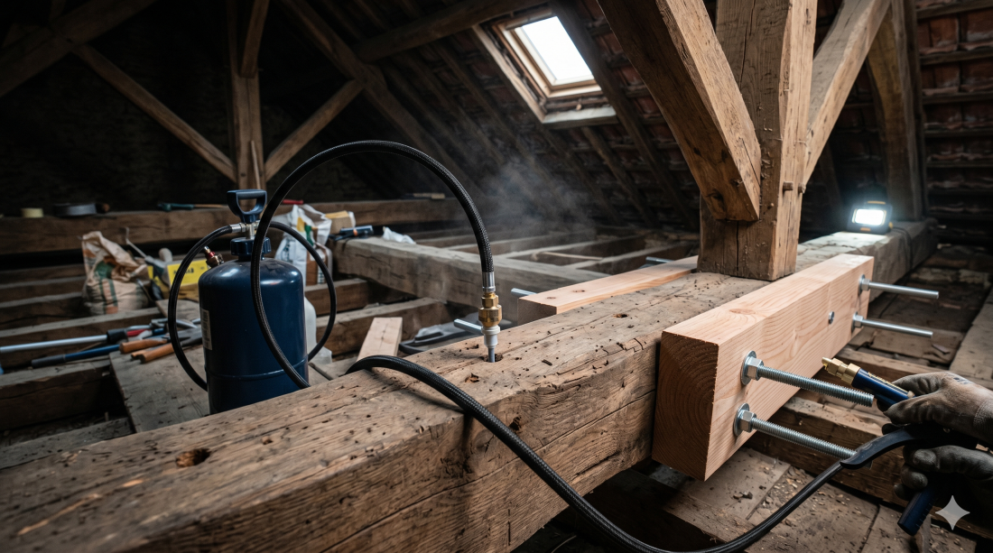 Nous avons mis en œuvre un traitement curatif par injection sous pression directement au cœur du bois, à l’aide d’injecteurs à clapets anti-retour. Cette technique permet de diffuser un produit fongicide et insecticide certifié CTB-P+ de façon homogène dans toute la masse du bois, éliminant ainsi les larves et stoppant les infestations en cours. La pulvérisation de surface complète l’action préventive sur les zones non accessibles à l’injection. Lorsque la solidité était compromise, nous avons procédé au moisage des arbalétriers, c’est-à-dire au doublage des pièces de bois afin de restaurer la résistance mécanique de la charpente.