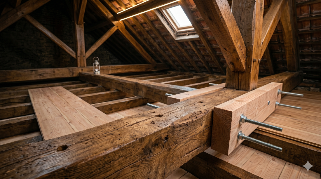 La problématique majeure identifiée sur ce projet résidait dans l’attaque silencieuse des poutres par les insectes xylophages. En effet, ces parasites rongent l’intérieur du bois, laissant l’extérieur intact et masquant ainsi la fragilité réelle de la charpente. Cette situation rend la structure creuse et incapable de supporter le poids de la couverture en cas d’intempéries. Pour éviter un effondrement partiel ou total de la toiture, il était indispensable de traiter en profondeur et de renforcer les éléments porteurs, notamment par le moisage des arbalétriers les plus endommagés.